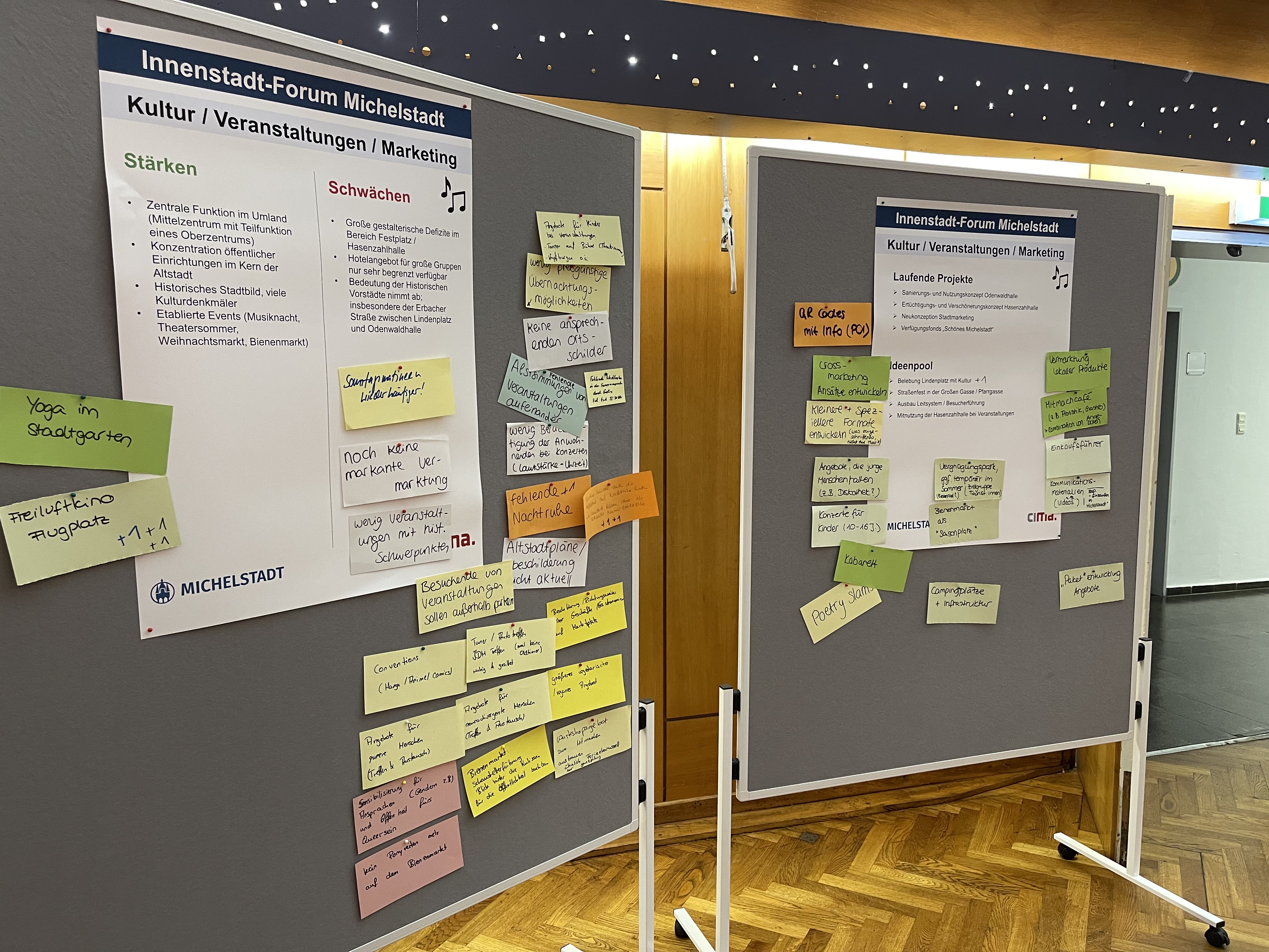 Zahlreiche Ideen und Überlegungen sind von der cima moderiert und mit den beteiligten Fachbüros erörtert und dokumentiert worden. Gesondert festzuhalten ist, dass durchweg an allen Thementischen eine Stärkung des Fußverkehrs mit gleichzeitiger Reduzierung des motorisierten Verkehrs in der Innenstadt gefordert wird. Mit der Veranstaltungsreihe Innenstadt-Forum ist ein erster Meilenstein gelegt, um die Michelstädter/innen aktiv in die laufenden Prozesse einzubeziehen und ihre Bewertung der aktuellen Situation und die Zukunftsvorstellungen aufzunehmen. Die Ergebnisse werden im Weiteren in die bereits laufenden Konzepte einfließen.